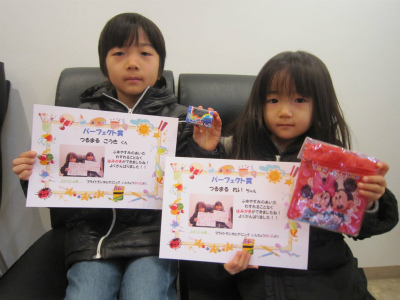 1月23日に持って来てくれたのは、矯正をがんばっているReinaちゃんとAnnnaちゃんの姉妹。いつも歯磨きカレンダーをパーフェクトでがんばってくれる、Michiruちゃん。この日持って来てくれた3人もパーフェクト賞でした[:にかっ:]